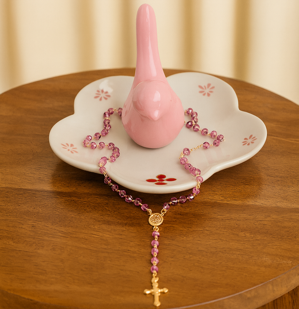 Delicate pink rosary with golden details.