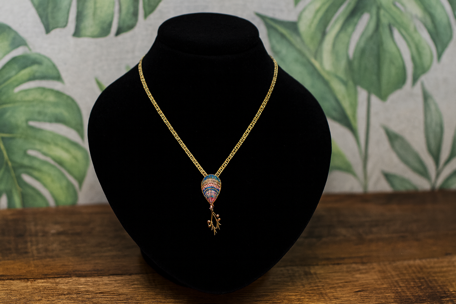Golden necklace with a colorful, ocean-inspired pendant.